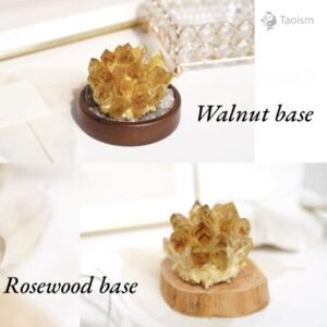 Selected natural Citrine crystal raw stone, paired with a sturdy solid wood base (optional Walnut or Rosewood, featuring natural grain and warm tones). Each crystal is a unique gift from nature, with slight variations in color and form.