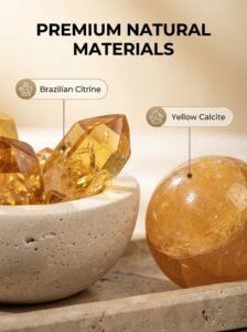 Composition of the “Gold Abundance” Formation: This set blends ancient wisdom with modern energy healing concepts. The core “Treasure Bowl” is carved from natural Calcite, serving to “gather” and “generate” wealth energy. The paired Brazilian Citrine, renowned as the “Merchant’s Stone” or “Success Stone,” emits a warm, bright energy specifically for attracting wealth. The Yellow Calcite adds a vibration of joy and creativity, making the process of attracting abundance a more pleasurable experience.