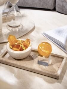 A beloved wealth Feng Shui formation among Asian healing practitioners. This set features a carefully curated combination of high-quality Brazilian Citrine and Calcite, artfully paired with crystal points, a crystal sphere, and a calcite treasure bowl to create a powerful “Gold Abundance” wealth-attracting pattern. More than a beautiful decor piece, it is an energetic system dedicated to attracting, multiplying, and guarding your prosperity.