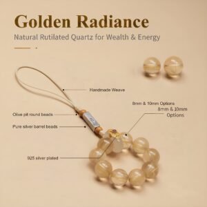 This meticulously hand-braided phone charm features natural Rutilated Quartz (Golden Hair Crystal), blending the stone’s inherent energy with artisan craftsmanship. The golden filaments symbolize wealth and auspiciousness, while the Pure silver barrel beads represents safety and well-being. More than an accessory, it’s an energetic companion that carries your intentions, infusing daily life with positive vibrations.