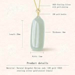 This natural ‘Qingshui’ Hetian Jade ‘Wushi’ Pendant, plain and unadorned, condenses pure energy. Crafted with 18K gold plating, it symbolizes nobility and eternity born from serenity. More than just jewelry, it’s a personal talisman carrying blessings of peace and your deepest aspirations, accompanying you on a journey towards well-being and fulfillment.