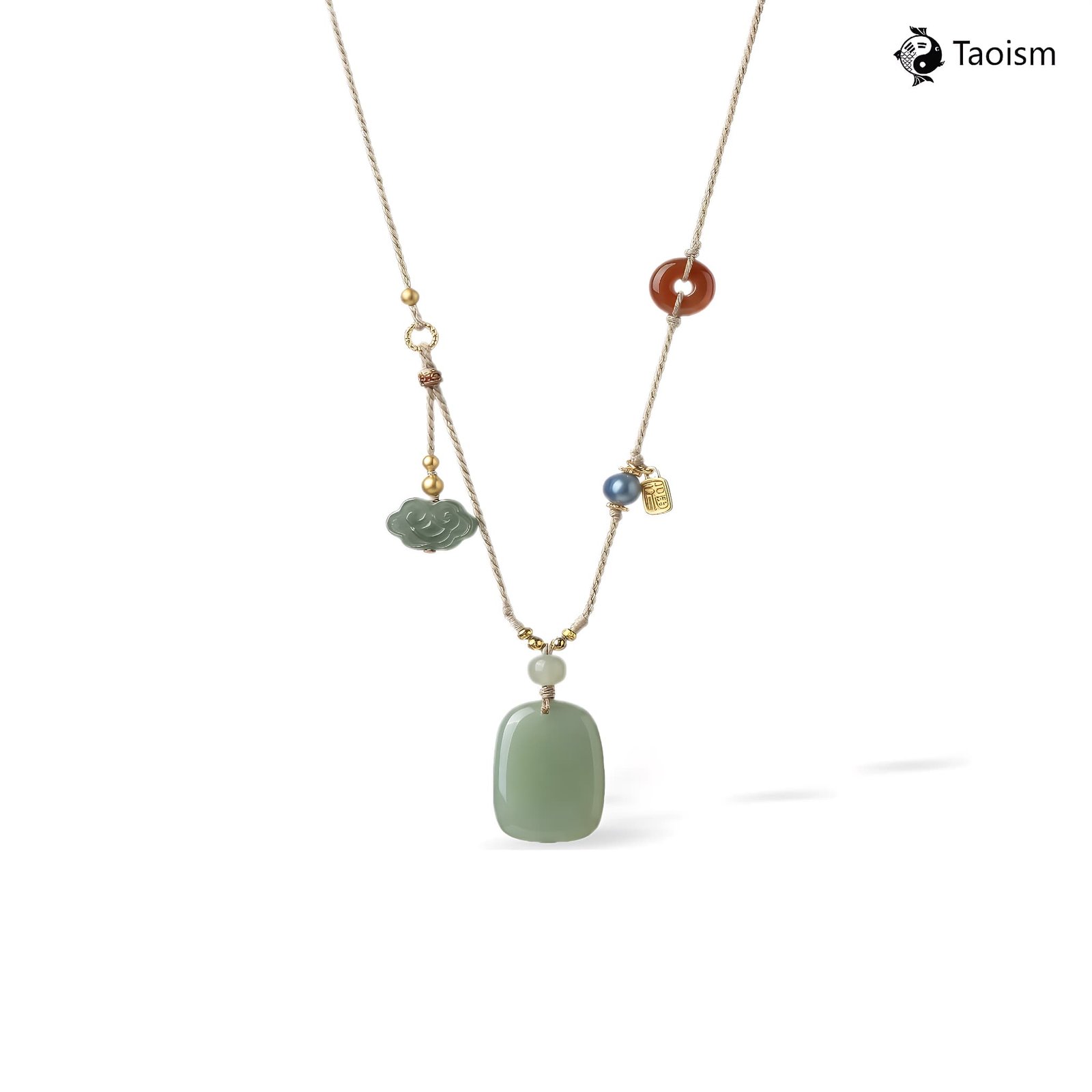 An interaction where Earth (Hetian jade) carries Water (clear-water hue), with the auspicious cloud motif introducing Metal’s flow and elevation, forming an indirect cycle of Earth generating Metal and Metal generating Water, condensed into an auspicious and luminous field of protection.