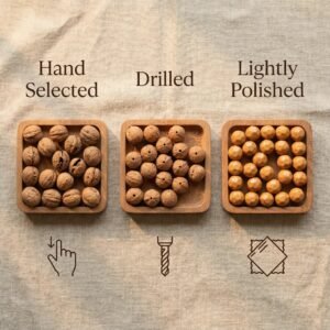 Hand-selected, minimally processed, and hand-strung. The nuts are carefully drilled and polished just enough to reveal their natural beauty while maintaining their rustic, organic character. No two beads are identical in shade or size, celebrating the uniqueness of nature’s creation.